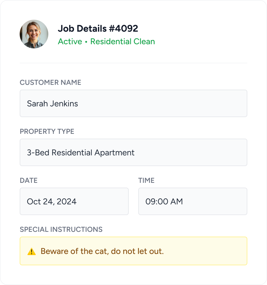Capture every important detail before the job starts. Customize fields for customer contact details, site info, and specific instructions.