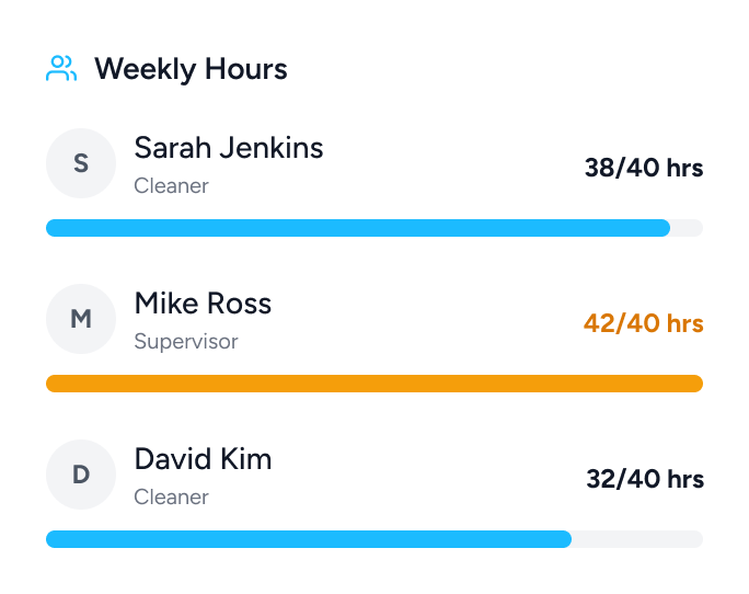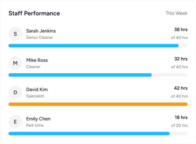 See which cleaner worked where. Track hours, monitor attendance, and identify workload issues early.