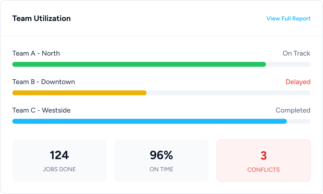 "Easy changes when jobs are added or moved. No manual route planning required."Get a bird's eye view of your entire operation. Spot inefficiencies, track progress in real-time, and ensure workloads are balanced across your team.