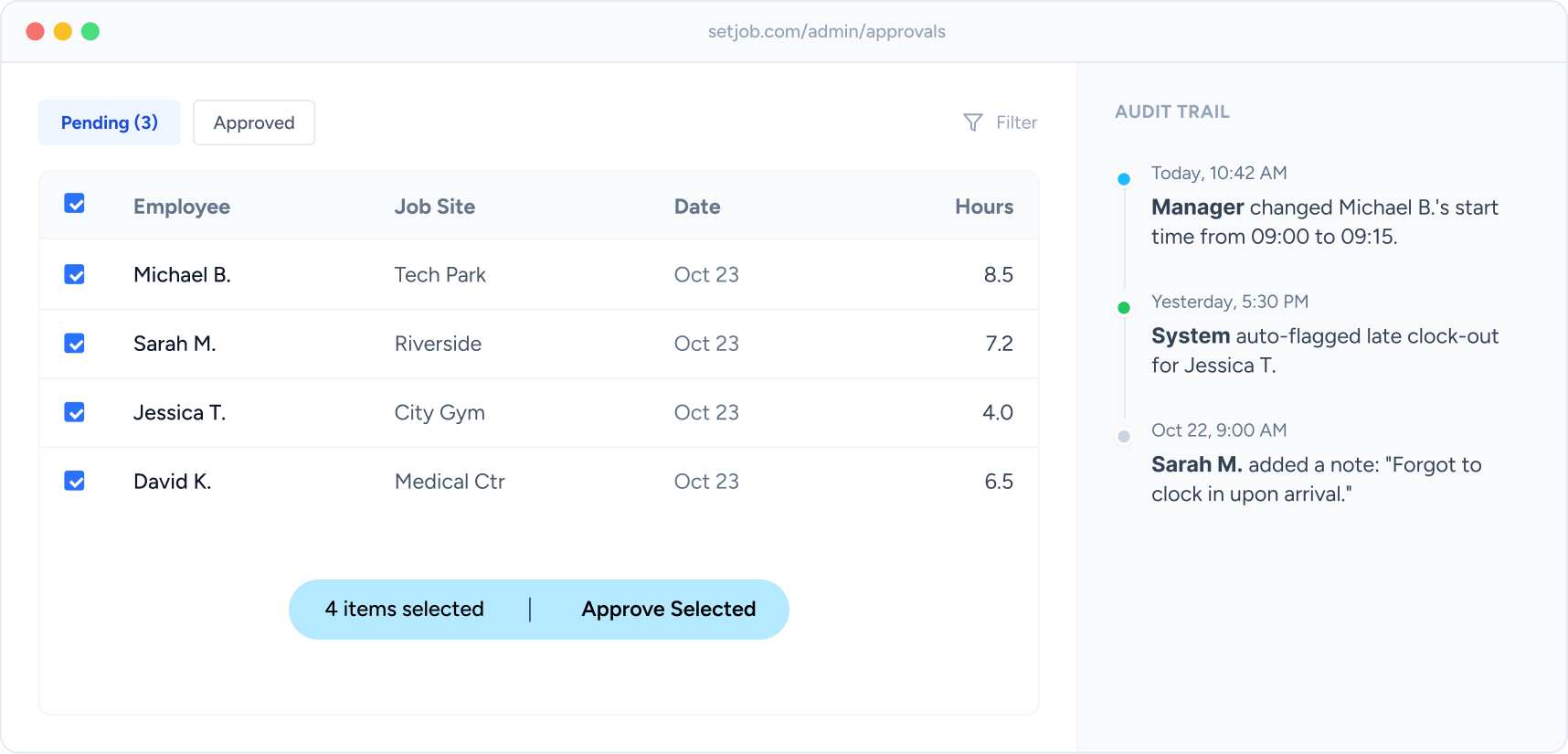 Streamline your payroll process with bulk approvals and clear audit trails.