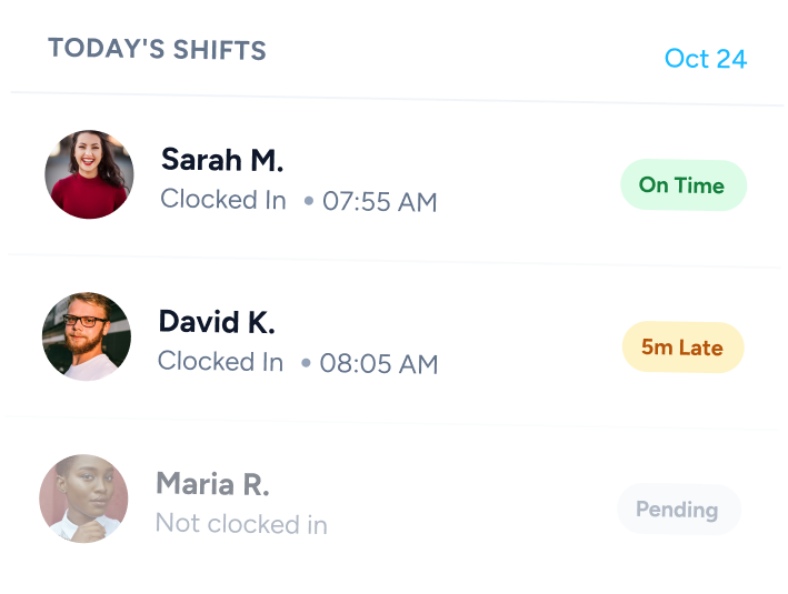 Get real-time visibility into who is working, who is late, and who is absent.
